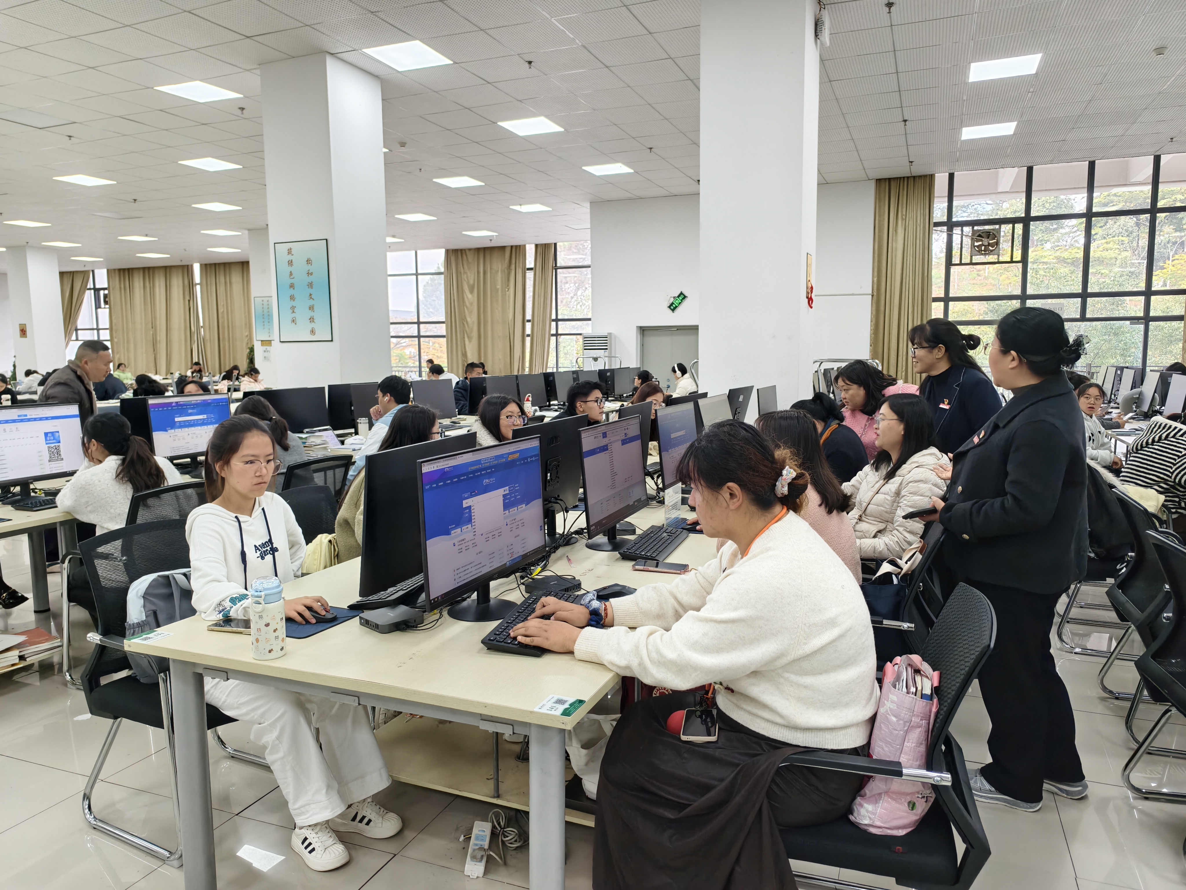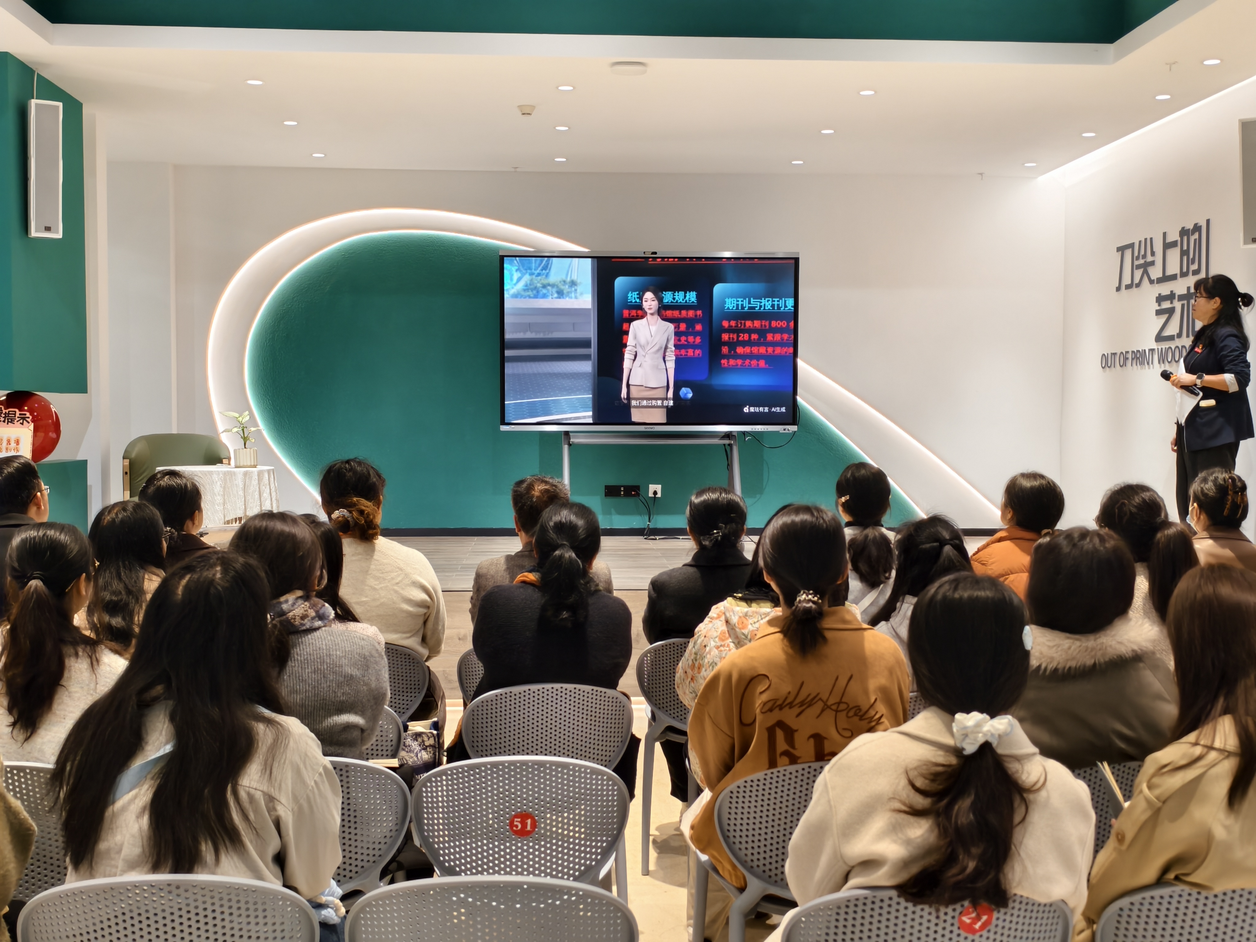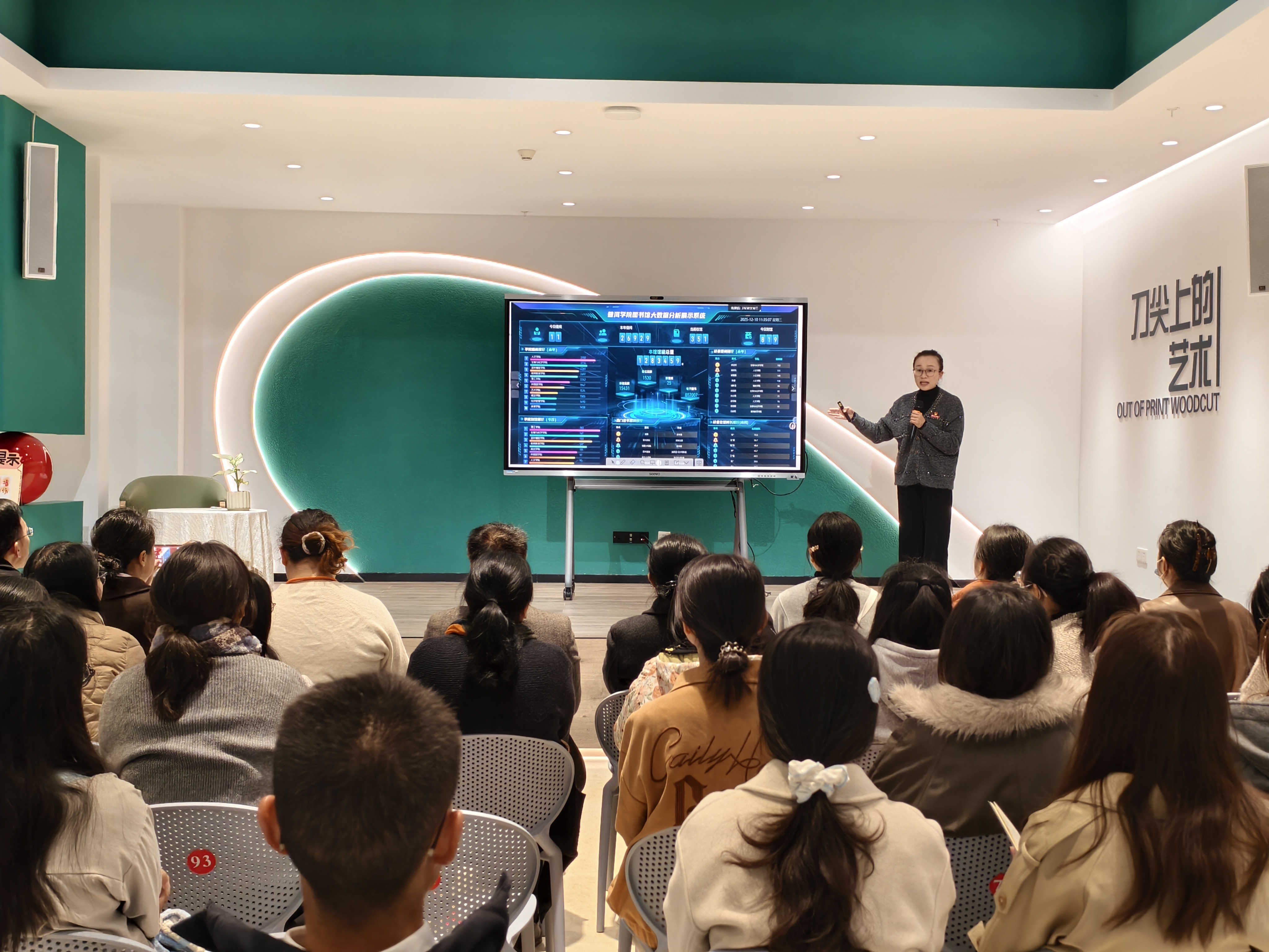 在知识经验分享环节,职能部门第十八支部委员会的同志围绕图书馆资源服务展开专题介绍。温春梅同志从大数据视角,详细讲解了与外国语学院专业相关的馆藏纸本资源分布、学生借阅率等情况;罗阳静同志则系统介绍了普洱学院智慧图书馆的基本概况、知网等数字资源的使用方法及研学平台功能,并组织参与活动的全体党员师生到电子阅览室进行实操演练,进一步提升数字资源利用能力,以数智赋能助力专业和科研。此外,活动还安排了红色文化体验环节,通过红色朗读亭、红色瀑布流、红色文化长廊和红色体验空间等载体,集中展示普洱学院网络思政平台的建设成果,引导党员师生在沉浸式体验中感悟红色精神。