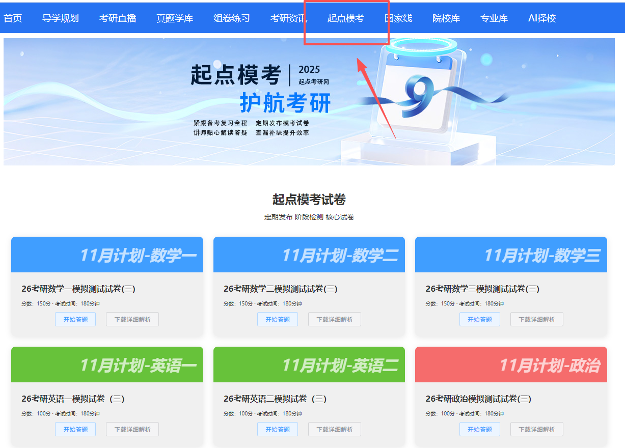 完成注册或登录后,点击页面上方 “起点模考” 板块,进入活动专属页面;