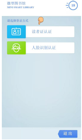 2.首页点击(借书)按钮,页面跳转至登录方式页面,根据页面动画指引将读者证放入读者感应区域内识别.