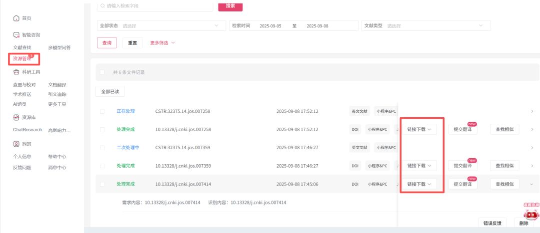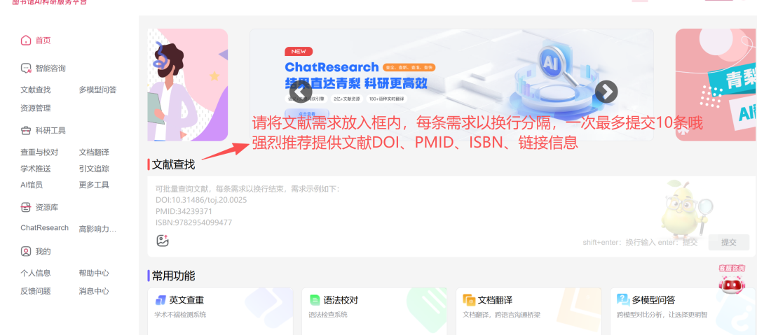 在“文献需求”框内粘贴或输入文献信息建议优先使用 DOI、PMID、ISBN 等标准信息。