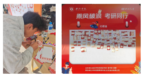 心愿墙前,同学们在色彩鲜艳的心愿卡上写下考研目标、励志语录与真挚祝福,一张张卡片层层粘贴,汇聚成满载希望的 “梦想墙”,传递着彼此的鼓励与期许。