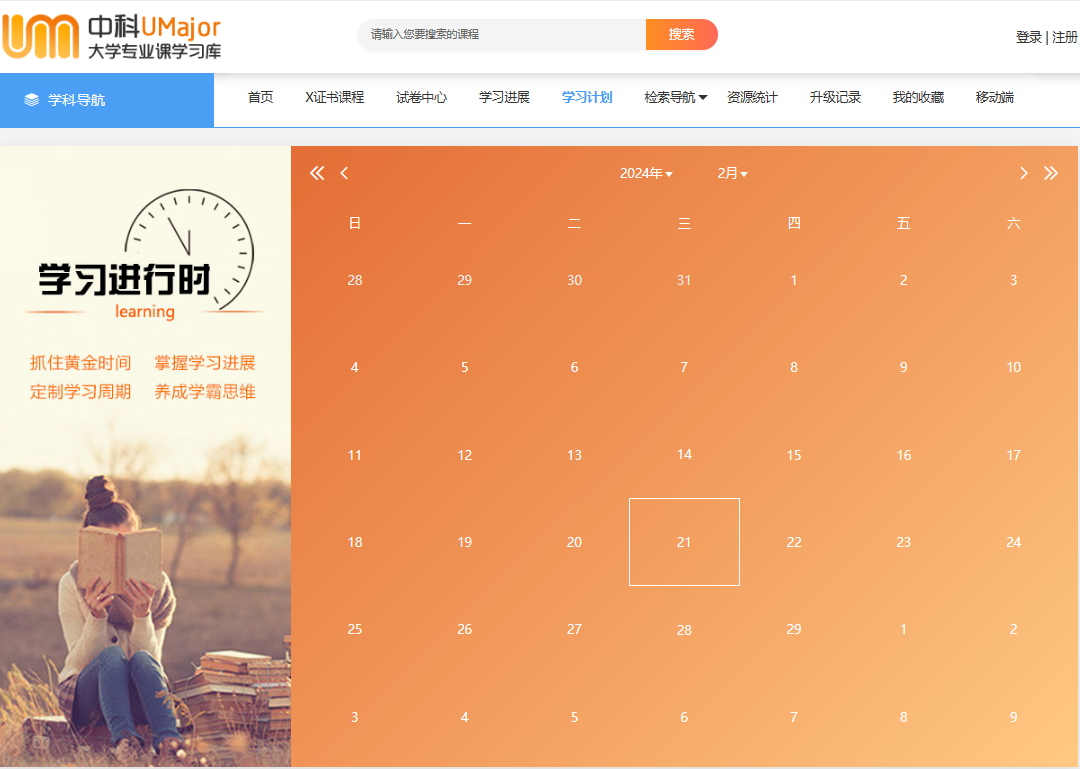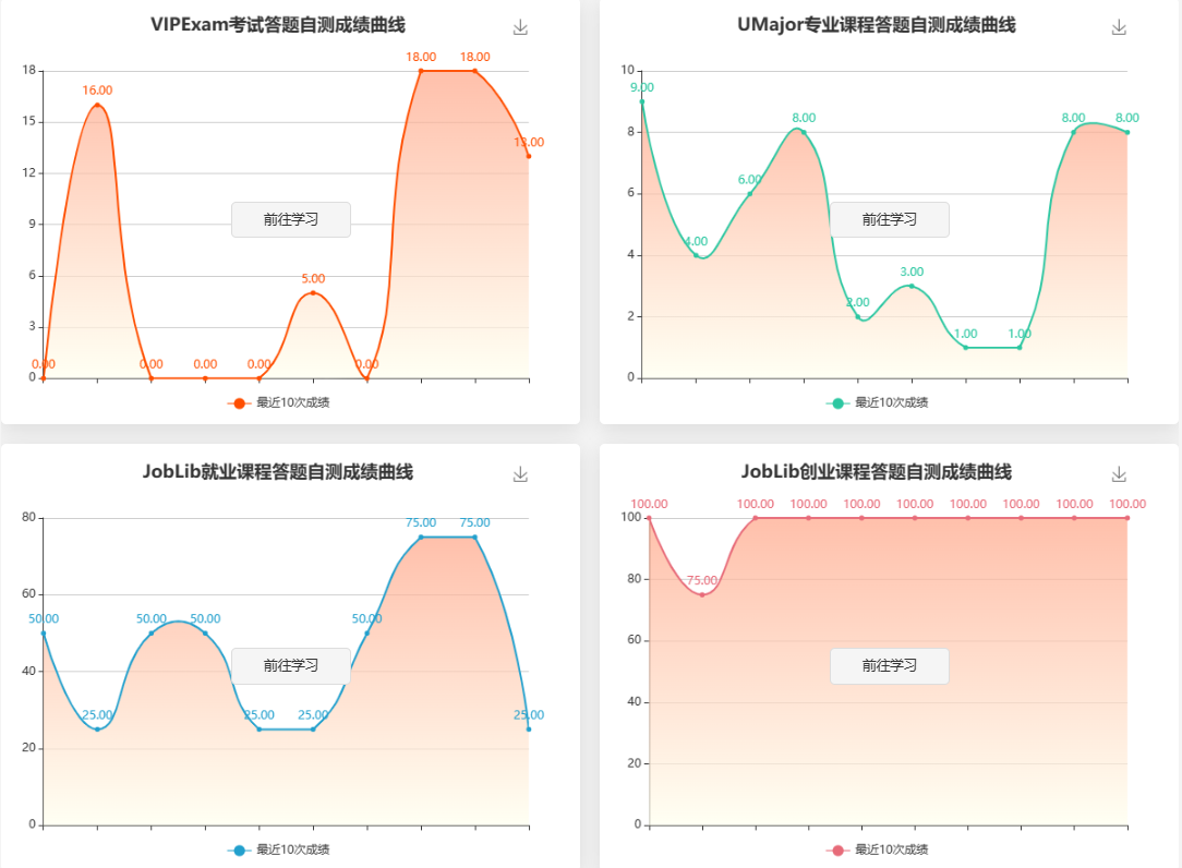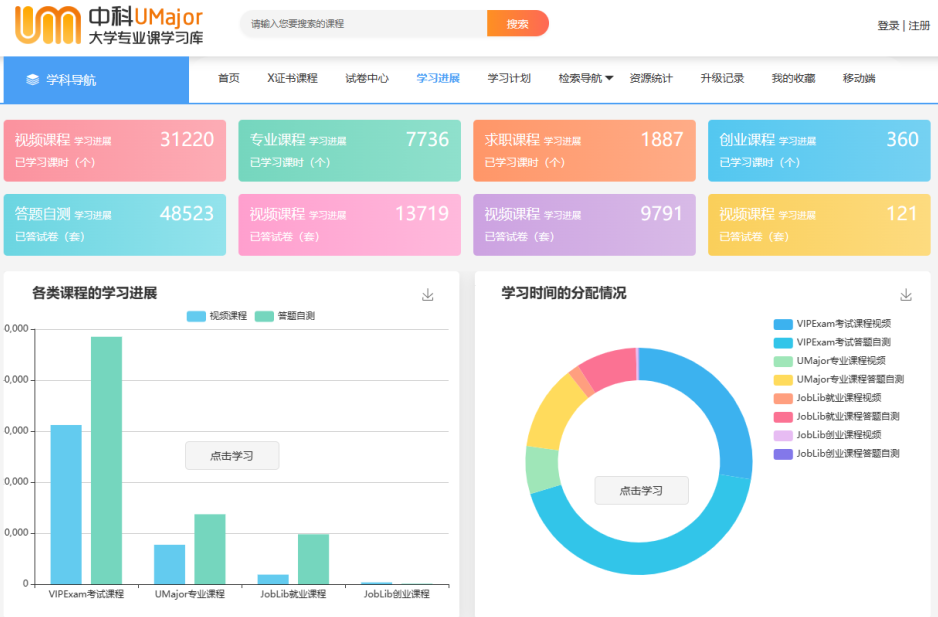 中科UMajor专业课库的学习进展、学习计划两大功能便于同学们统计自己的学习进展以及学习时间分配情况,还可以全面呈现各类成绩曲线!