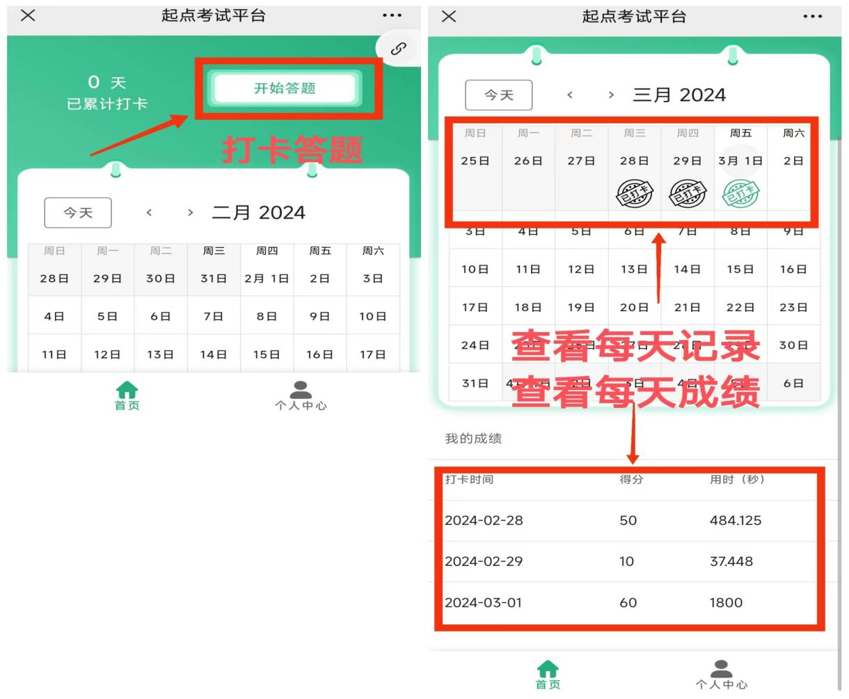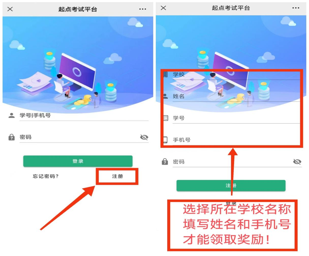 同学们进入平台后需先注册,填写本人所在学校、院系、学号、个人姓名、联系方式,以便成绩统计,通知领取奖品。(已经注册过“起点考试网”账号或参加过往届竞赛活动的同学们,无需注册,直接账号登录即可。)完成注册后进入打卡页面,点击“开始答题”作答交卷即可,记得坚持每天打卡哦!