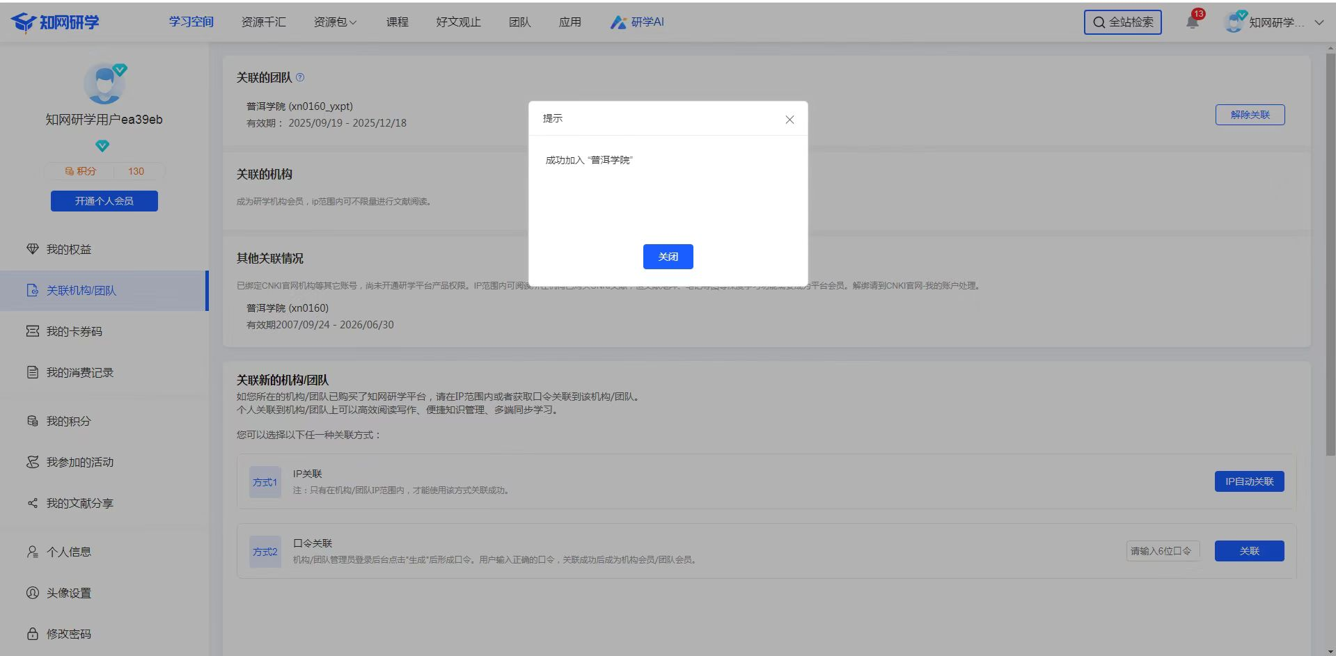 3、通过在普洱学院IP范围内点击IP自动关联,显示“成功加入普洱学院”,即可获取知网研学和AI应用权限。