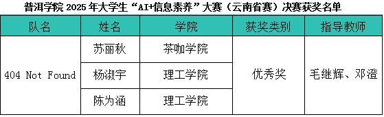 2025年11月19日,2025年大学生“AI+信息素养”大赛(云南省赛)圆满落幕并公布获奖名单。本次大赛云南共有29所高校8657人(本科生7761人,研究生896人)报名,6228人(本科生5613人,研究生615人)参加了大赛。经校级选拔赛环节,共有95支队伍(每支队伍3人;本科生64支、研究生31支)进入省赛。我校代表队在大赛中获得荣誉,学生代表队表现出色,荣获大赛优秀奖;邓澄老师荣获,校图书馆荣获优秀组织奖。