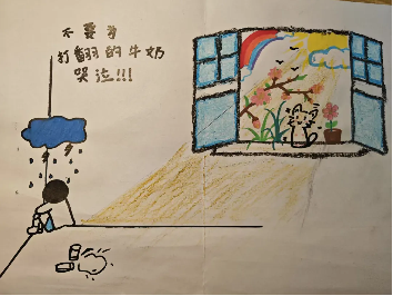角落抱膝而坐的男孩,头顶的乌云代表及心情,一旁打翻的牛奶揭示了原因。但打开的窗口外是艳阳彩虹,是小鸟小猫,是浪漫桃花茂密绿叶。所以,亲爱的朋友,请不要为打翻的牛奶哭泣,打开窗你会看到悲伤融化。