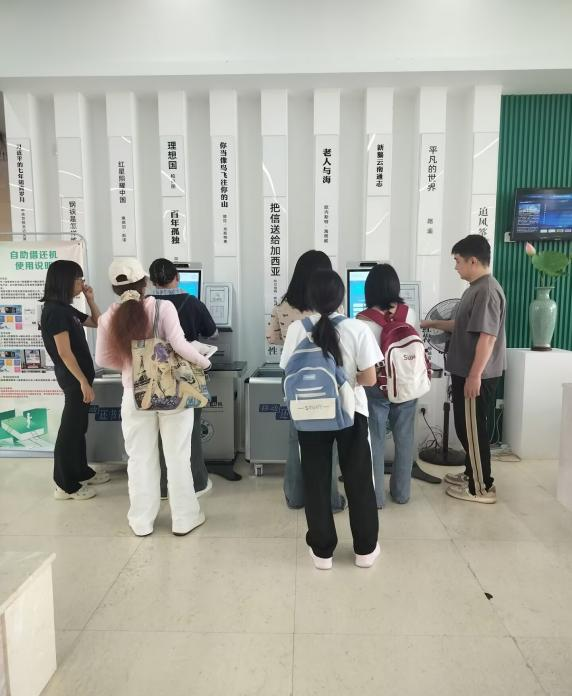最受新生关注的当数 “借阅权限开通与实操指导” 环节,在自助借还机前,指导老师手把手教学:“先刷脸或电子借阅证,再把图书放在感应区,确认借阅信息后点击‘完成’,就成功啦!” 新生们纷纷拿起提前挑选的图书尝试操作。