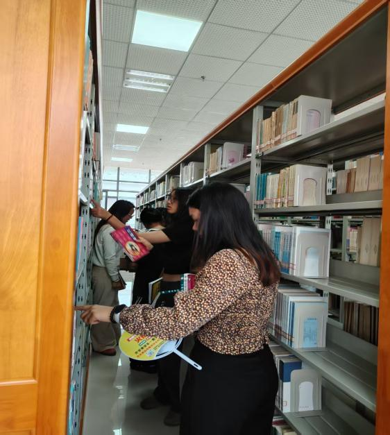 随后,在指导老师的带领下,新生们开启 “图书馆探索之旅”。从一楼的自助借还区,到二楼的文学书库、三楼的自然科学书库,再到四楼的艺术书库、地方数据库、捐赠书库,指导老师们边走边示范:就每排书架的索书号标识,根据‘分类号 + 种次号’教会新同学能精准的找到目标图书”。