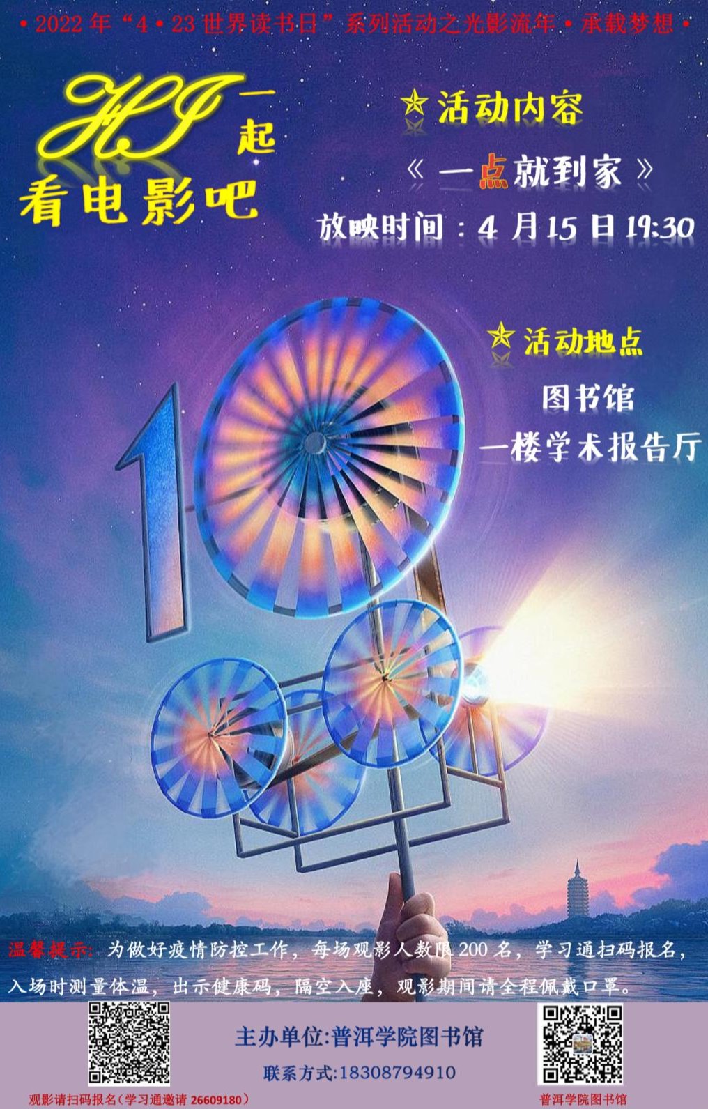 各位读者,“4.23世界读书日”电影月活动第二期来啦!4月15日19:30分,图书馆在一楼学术报告厅即将放映影片《一点就到家》,观影名额有限,欢迎大家积极报名参与!请需要报名的同学,打开学习通,扫描下方二维码进行观影报名!